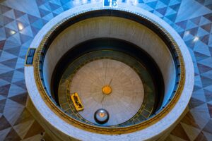 Above the pendulum, the building itself tells another story. Murals by Hugo Ballin ring the dome, painted in 1934 in a style that “really screams 1930s,” says Seidel.