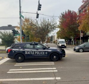 A Seattle Police Department vehicle turning onto University Way Northeast. [Credit: Emily Iris Dickinson]