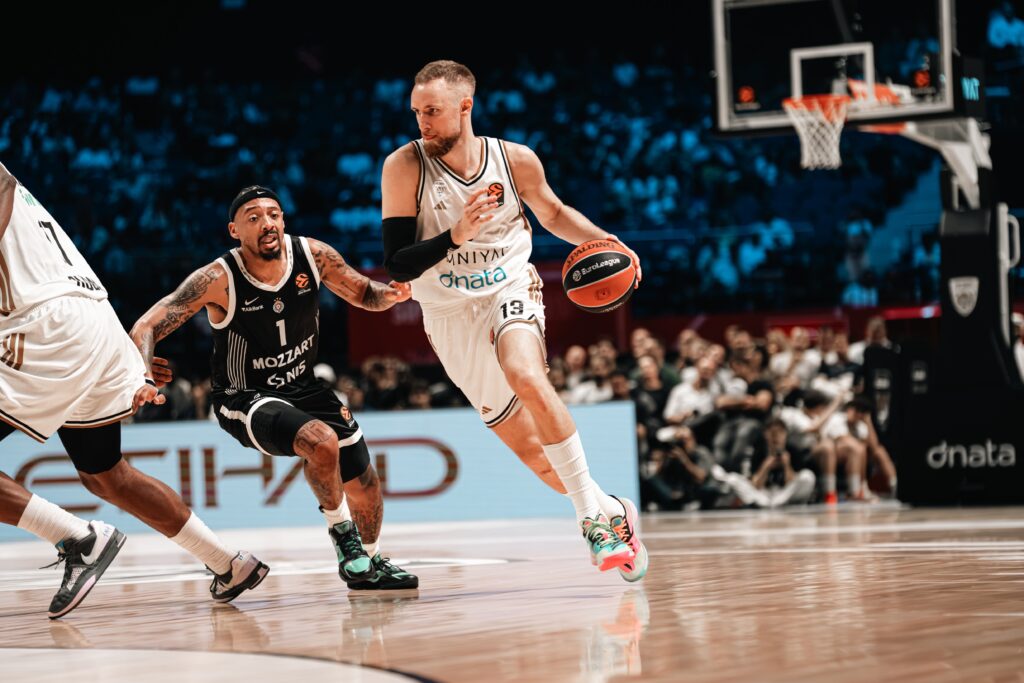 Dubai Basketball forward, Dwayne Bacon, dribbling ball against Mozzart Bet Belgrade (Courtesy: Dubai Basketball)